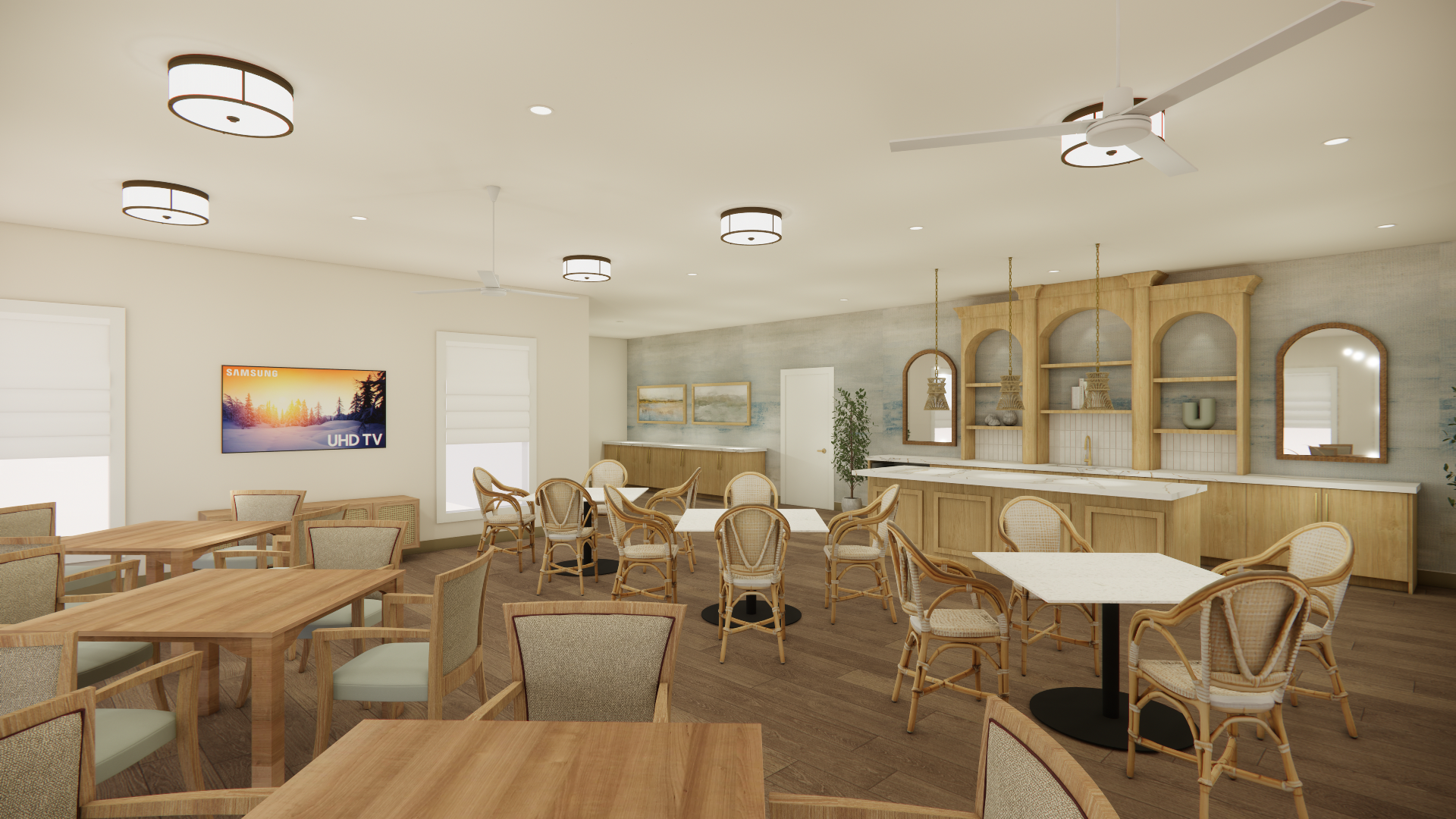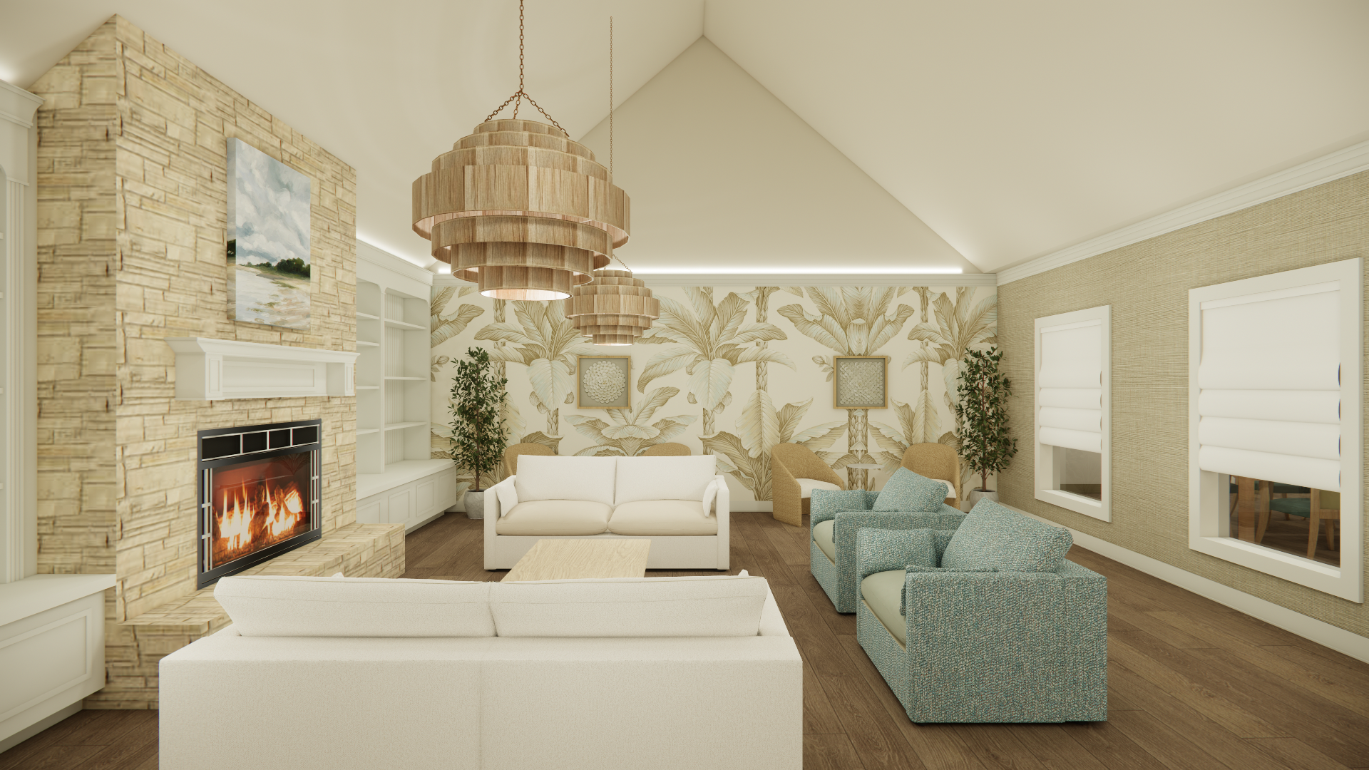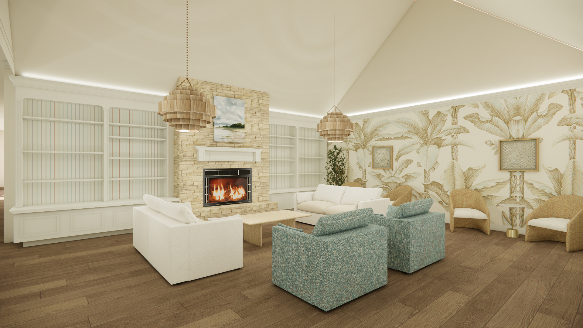 Soft coastal hues, natural textures, and layered light create an atmosphere that feels both serene and social. From the inviting living area to the bright gathering rooms, each space was designed to foster connection, conversation, and a vibrant sense of community.